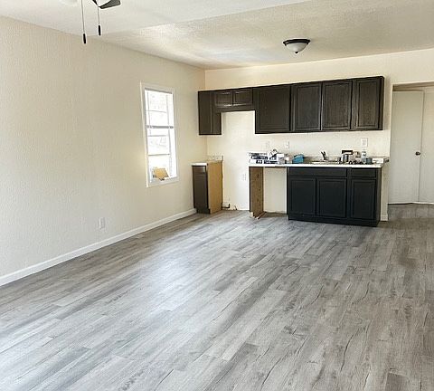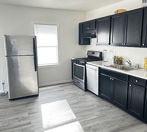 Inside, you'll love the modern kitchen featuring sleek dark cabinetry, a stove, dishwasher, garbage disposal, and generous counter space. The updated bathroom continues the same elegant design for a cohesive look.