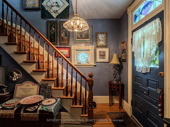 The home is decorated in the vintage maximalist style in keeping with its current role as a Stratford artist retreat. This two storey Victorian features original floor plan and character details - beautifully refinished hardwood floors, staircase, stained glass windows and some light fixtures. Updates include the addition of a steel roof, eavestroughs and fascia (2024) furnace (2020) air conditioner (2020), electric panel (2020) bathrooms, custom made screen doors, large porch and return to period decorating throughout. Appliances included. Mature and highly desirable Stratford neighbourhood with an easy walk to a unique and lively downtown, library, parks, river front, choice of public schools and all theatres.