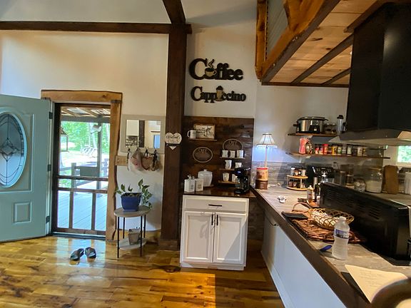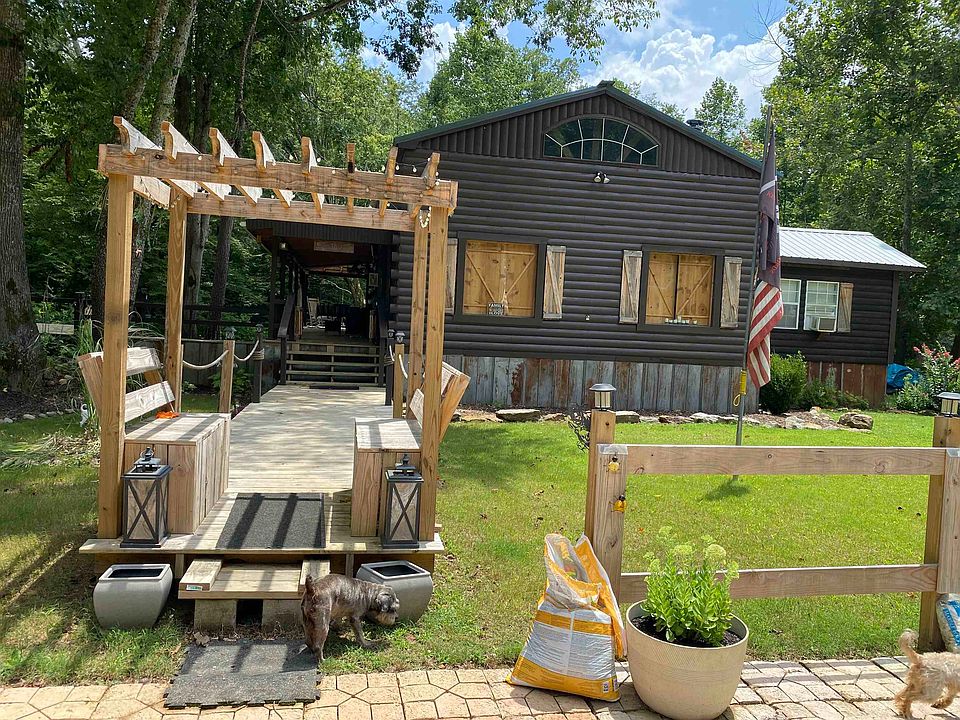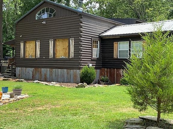Beautifully designed log cabin style home sitting on approx 4.2 acres of level land & over 250' of Turkey Creek running along property. The setting is absolutely gorgeous & serene. This 2 bedroom, 1 bath home has such natural beauty inside. Custom work is unbelievable. Above ground pool & equipment stay, all appliances including washer & dryer, camper w/camper hookup, unfinished tiny house, tool, work shed & chicken house. Spring water plumbed to house & camper. Off the grid living at it's best.