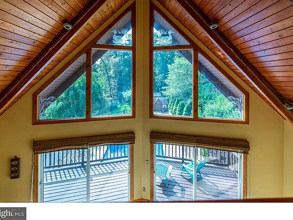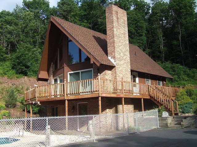 !! PARADISE FOUND !! ENCHANTING Chalet Nestled in the Privacy of 8.7 acres ' In Ground Pool ' Wrap Around PORCH ' Propane FIREPLACE ' Custom Cabinetry in Both Kitchen and Main Floor Bath ' 3 Floors each feature a Full Bath ' 1st Level conducive to In Law Quarters .. Large Bedroom plus 2 other Rooms to accommodate this PLUS Modern Chair Lift currently installed to Main Floor ' STUNNING Vaulted FIRWOOD Ceiling and Wall of Windows greet you as you enter' Brand New Carpet leads to gorgeous tile Floors in Kitchen Dining Area which leads to Back Porch were you embrace Nature by Visiting Deer in your Back Yard' Bedroom and Full Bath completes this floor' 3rd Floor boasts Master Bedroom with Cathedral Ceiling plus Wall Of Windows to let the day greet you ! Full Bath tiled with imported Italian Tumbled Marble plus Swarovski Crystal Accents' No Detail Overlooked !! PLUS HORSE PASTURE fully ready for your Equestrian Friends ' Fenced and Gated 6 Stalls plus Hay Storage plus small Den/Office ' Other Out Buildings Present ' 2 Pastures with Water Droughts in both . Central Air for Summer Comfort 'Efficient Harmon Self Feeding Stove for winter warmth or utilize Electric Heat which can be controlled individually in each room. EXPERIENCE THE MAGIC ' Call for Private Showing Today !!
