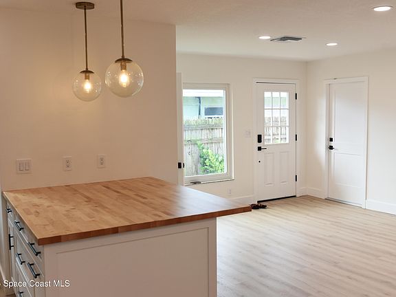 Live the Cocoa Beach lifestyle! Only 2 blocks from the ocean, this fully remodeled 2-bedroom, 1.5-bath half duplex offers modern coastal living in the heart of downtown Cocoa Beach. Taken down to the studs and rebuilt, it now features luxury vinyl plank flooring throughout, brand-new impact windows, and a stunning kitchen with butcher block counters, new stainless steel appliances, and abundant cabinet space.