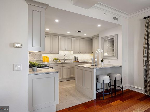 Magnificent, custom residence overlooking Rittenhouse Square. One-of-a-kind Rittenhouse Square facing three bedroom, three full bathroom residence with all rooms looking out onto Rittenhouse Square. The home has been meticulously maintained and beautifully updated. Through a welcoming foyer with large coat closet is the grand great room boasting architectural ceiling details, two west-facing Juliet balconies that literally bring the Square into the condominium, and an open living/dining area, ideal for entertaining. Adjacent is the beautifully-appointed, open kitchen with custom cabinetry, marble countertops, designer marble tile backsplash, stainless steel sink with garbage disposal, under cabinet lighting, tile floor, breakfast bar, and a suite of high-end appliances including a stainless steel Wolf gas oven and range with hood, Bosch built-in microwave, paneled Bosch dishwasher, and paneled Sub Zero refrigerator. The luxurious primary suite features spectacular light from two Juliet balconies overlooking The Square, space for a seating area, two walk-in closets with custom built-ins, and a spa-like ensuite bathroom appointed in marble with double vanity, separate water closet, tub shower, and glass enclosed walk-in shower. There are two additional bedrooms with oversized windows and deep wall closets that enjoy use of their own adjacent hall bathrooms both boasting beautiful marble tilework throughout. One bathroom has a glass enclosed walk-in shower and the other has a tub shower and laundry closet with stacked Whirlpool washer/dryer. Additional home highlights include Brazilian cherry hardwood floors, crown and baseboard molding, custom trim and millwork, and recessed lighting throughout. Two parking license sand storage room in the building are also included. Residents of Parc Rittenhouse enjoy world class amenities and services including a 24 hour doorman; an amenities suite that includes a brand new state-of-the-art fitness center and resident lounge with pantry; media room; outdoor rooftop pool club with a large pool deck, full size pool, kids pool and hot tub; garage parking below the building for an additional fee; and two amazing restaurants on the ground floor, Stephen Starr’s Parc and Via Locusta.