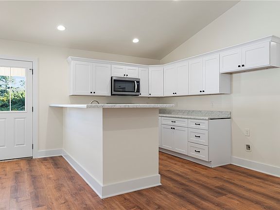 Covered front porchWhite kitchenStainless appliancesVaulted ceilings