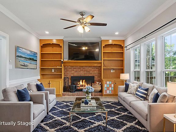 Open the door to a traditional foyer with formal dining room on the right and a designated office/ playroom space on the left. You'll pass the half bathroom to see an open concept living space and kitchen with huge windows facing the back deck and yard. The TV is already mounted over the fireplace (and stays with the home!)