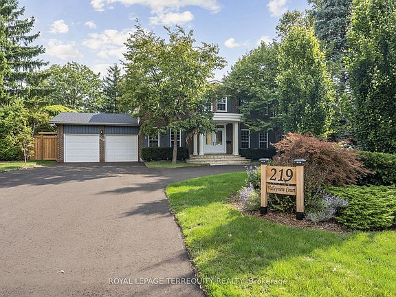 Welcome to prestigious Valleyview Court - an enclave of mature multi-million dollar homes with a parkette at your doorstep. 219 has an incredible 162 ft of frontage onto the court, with a circular driveway, double car garage with electric car charger, and over 140 ft of depth that offers green space for kids to play, a large pool to lounge beside and gardens to enjoy. This larger than average lot has it all. With 4+2 bedrooms, 4 bathrooms, and 2 kitchens this is a home you can grow into, or look forward to hosting in. The living space lets in lots of natural light with skylights and large windows giving clear sightlines from the kitchen through open concept dining room, towards the backyard and pool - great for keeping an eye on friends and family while they swim. The wood-burning fireplace in the living room offers a cozy retreat in the cooler months. With a large office off the main entry, this would be an excellent work-from-home property - imagine watching from your desk as clients pull up on your circular driveway. Upstairs all the bedrooms are all generously sized with large windows and closets. The primary has a walk-in closet + double closet and 5pc ensuite bathroom with jacuzzi. Downstairs the open concept rec room / games room / bar is a great place to relax with luxurious built-in cedar lined wine cellars - a gorgeous compliment to the space. The gym is separated with a glass wall to keep you focused during workouts and the new basement kitchen is fully equipped - great for in-laws or food prep on game nights. The walk-up also offers direct access into the back yard. The home has numerous recent upgrades and renovations including a brand new driveway, and your realtor can provide you with a feature sheet detailing the work. This is a wonderful opportunity to own a great home in a spectacular neighborhood, just a short walk from parks, the lake, schools, transit, and more.