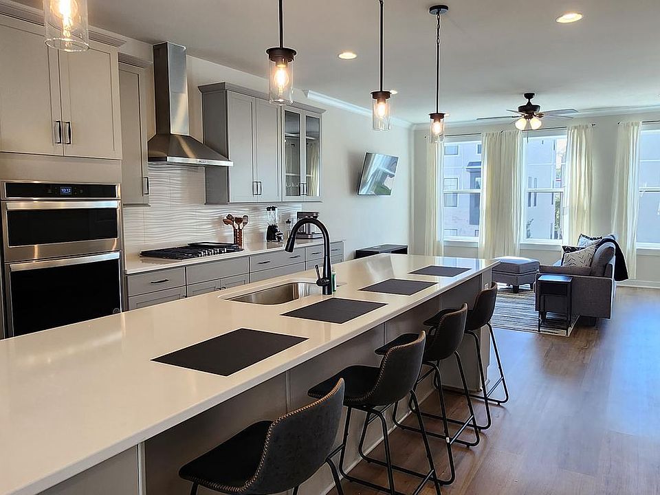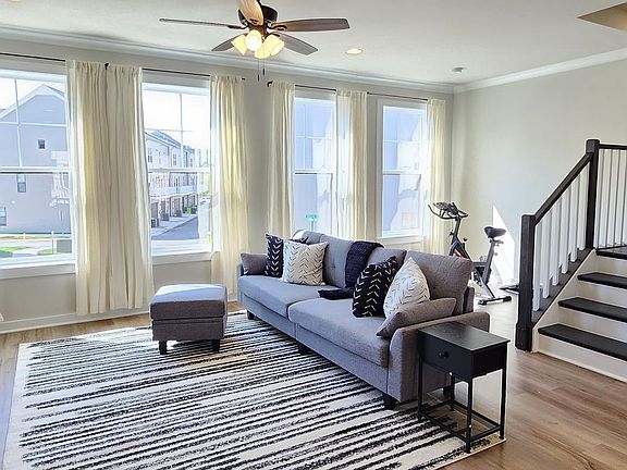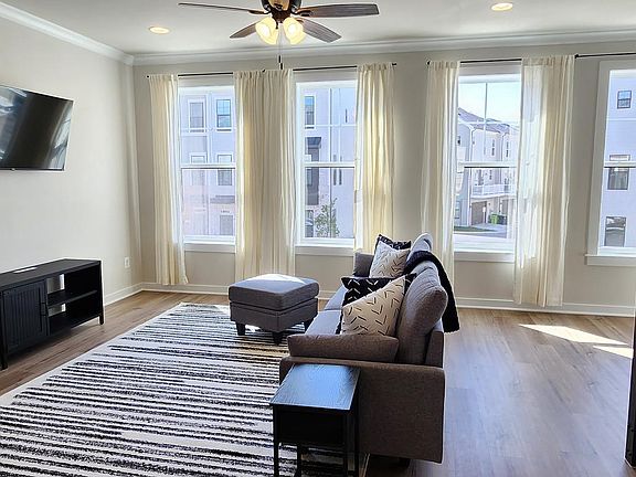 Beautiful 4 bdrm townhome. Semi- furnished. You can lease as short as 6 months, schedule your tour today. Choose to enter your home through the rear 2-car garage or the covered front porch with the Caroline home design. The entry opens to a foyer, bedroom and full bathroom. On the second level you will find a stunning center gourmet kitchen with a generous island, the living room and a breakfast area with a half bathroom. Enjoy your large deck off dining room with a 12-foot sliding glass door. Retreat to the third level to the private owner's suite with an expansive walk-in closet, dual sink vanity, Roman shower in the owner's suite, and walk-in shower. Two additional bedrooms, a full bath, and laundry area complete the upper level. Admire the 9-foot ceilings on all three levels.