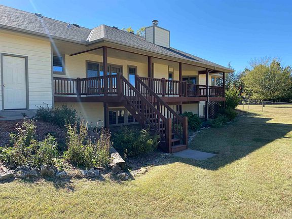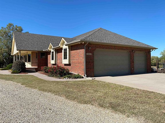 Welcome to this stunning 8.34-acre property conveniently located in west Sedgwick County, just 10 minutes from Wichita and 3 miles from Goddard. A tree-lined drive and beautiful pond guide you to the 5-bedroom and 4-bathroom home. Entering the foyer, you will notice a spacious kitchen with eating area, a formal dining room and living room providing beautiful views of the land and all the space needed to enjoy family and friends. The primary bedroom includes a private bathroom with jetted tub, separate shower, and large walk-in closet. On the main floor you will also find an additional bedroom and full bathroom. From the large 3-car garage you get a “mud room” area with a laundry and bathroom with a large sink and shower. The huge covered deck, perfect for entertaining, has access from the dining room as well as the primary bedroom. The home has been extremely well maintained with brand new roof and gutters installed in September 2023 and new geothermal heating and air system in August 2023. The home is fitted with a 1-year old 50-gallon water heater and water softener & reverse osmosis water system. In the backyard you'll find a nice chain link fence that surrounds a spacious yard. Just outside the fence sits a fantastic 30' x 45' Morton building with 220 power, concrete floors, and 2 garage doors with openers. Right by the Morton building is another 12' x 24' open faced building for all of your storage and hobby needs. The property is in Goddard schools and close to Wichita amenities, making this charming property and peaceful country living ready for you. Don't miss your chance to make this extraordinary property yours today!