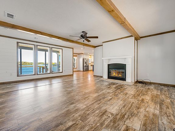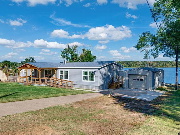 Beautiful 2024 Cavalier Manufactured Home on two waterfront lots on Lake Palestine! Located on a peaceful fishing bay, this property offers the perfect blend of relaxation and recreation with approximately 100 feet of shoreline and a level to gently sloping yard leading to the water. A concrete driveway leads to home with 1,845 sq. ft. of living space, in excellent condition and ready for lake living! The spacious open floor plan features a large living area with picture windows overlooking the lake and a beamed ceiling and gas fireplace, creating a warm and inviting atmosphere. The kitchen is well-equipped with refrigerator, stove, microwave/vent-hood, dishwasher, and a center island with electrical outlets—ideal for meal prep and entertaining. The adjoining dining area also overlooks the lake, providing beautiful views while you dine. Access the covered back porch with steps leading to the back yard and boathouse. A highlight of the property is the 20' x 38' shop/garage—perfect for storing boats, lake toys, or vehicles—and includes a wood-burning stove for year-round comfort. Boathouse needs repair. With short-term rentals allowed, this property offers both personal enjoyment and excellent income potential!