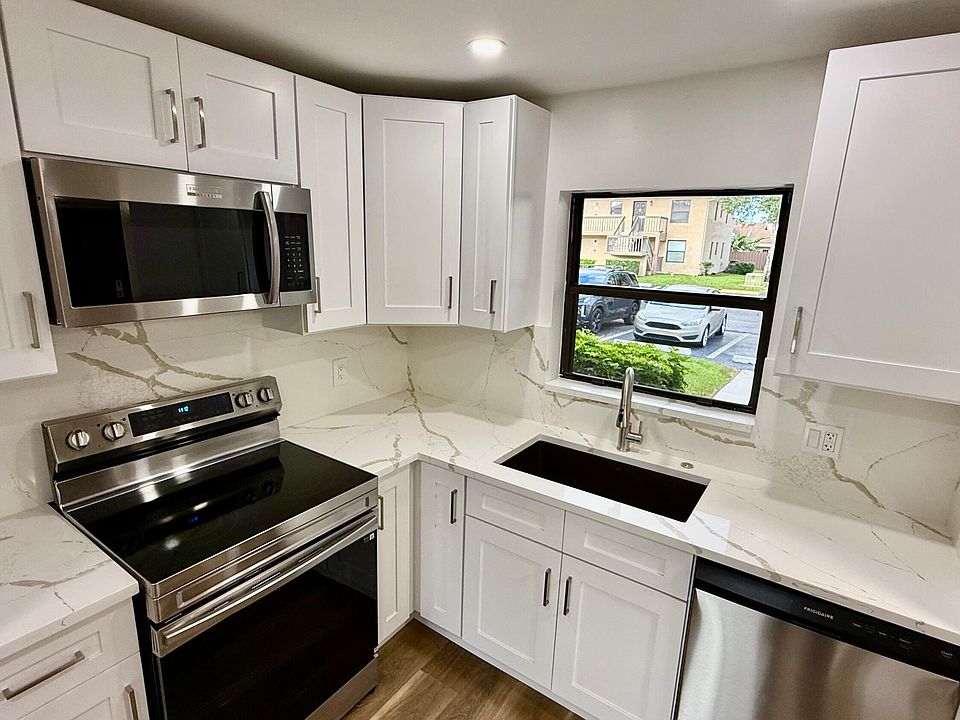 WOW !!Remodeled 2 bedrooms , 2 bathrooms 1st floor condo with lakeview and steps to the community pool .Great Central location at the heart of Boca Raton , close to shops, major roads and shopping .Brand New appliances , flooring , bathrooms , kitchen , light & plumbing fixtures .CAN RENT RIGHT AWAY !! (Easy $2,500 PM)HOA is only $ 350 per month ; water & cable is included in the dues .