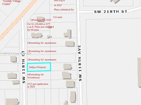 professional feasibility study in attachments - Up to 22 units/12 stories/ 0 ft setbacks from the side and back 10 ft setback from the front. 100% parking reduction can be applied, OR UP TO 8 Townhomes with 12 parking spaces Every lot on the street currently being developed. See map. To the north and south abutting the property are both in permitting. North - 18 unit project. Lot to the South is townhomes 3)WASD agreement screenshot. Townhouses to the south confirmed will be running sewer extension south along SW 118th St abutting this property for connection 4)Double lot on the corner is maxing out the zoning in planning for 44 units and sold for $77 a sq ft $1,150,000 last year. Backside of the property SW 118th they purchased an assemblage for $2,500,000 w/ plans for 123 units.