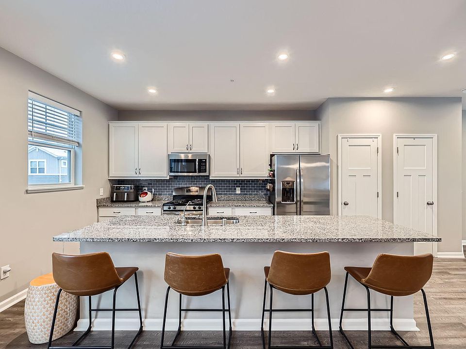 This stunning home features an open-concept floor plan with expansive windows that flood the space with natural light. Enjoy sleek modern finishes and a host of upgrades thoughtfully completed by the seller. The bright, white kitchen boasts a custom tile backsplash, an oversized center island, stainless steel appliances, and a spacious walk-in pantry. The cozy Family Room is anchored by a gas fireplace with elegant tilework and custom built-ins on both sides. Upstairs, you'll find three generously sized bedrooms, two full bathrooms, and a convenient laundry area. Garage offers abundant storage and endless possibilities. Ideally located with easy access to major highways, shopping, dining, and the scenic Gateway Bike Trail. Enjoy low-maintenance living with snow removal and lawn care included—association living at its finest.