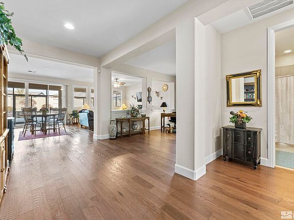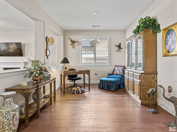 This single story home is located in the Regency 55+ at Presidio gated, active lifestyle community, and has been meticulously cared for. It has gorgeous wood flooring throughout, upgraded primary walk in shower enclosure, double sinks in the primary, large walk in closet, L/R fireplace, and a beautiful enclosed back patio (324 ft. sq. per assessor), not included in the 1661 sq footage of the home. The garage is one of the larger 2 car garages in this community, and has newly epoxied floors., There are 2 clubhouses, indoor pool, seasonal outdoor pool, fitness centers, billiards room, library & more. Beautiful pickle ball, tennis, bocce & horseshoe courts. On sight management teams & activities coordinator for frequent events & social activities. The HOA maintains the xeriscaped front yard. The xeriscaped backyard is automatic dripped and boasts beautiful flowers in the spring. Elevated fence line in the large backyard for privacy. W/D, refer & garage cabinets stay. Furnishings negotiable.