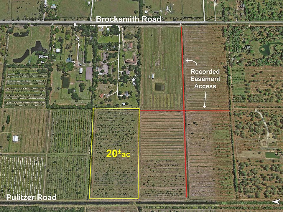 This 20ac Tract is accessed by easement from paved Brocksmith Road and can also be reached from Pulitzer Rd on its west side. A former grove and with good drainage, this site could now be a lovely estate homesite offering privacy without a remote location. ~ See BROCHURE in Documents section ~