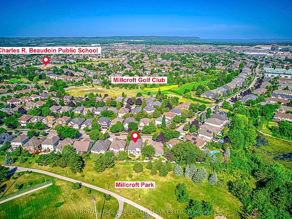 Beautiful 4+1 bedroom home backing onto Millcroft Park, offering peaceful views and excellent privacy with no rear neighbours. The open concept layout features a dramatic two-storey great room with soaring floor-to-ceiling windows that flood the space with natural light. A custom-designed fireplace adds warmth and character to the main living area. The chef's kitchen boasts granite countertops, upgraded cabinetry, and hardwood flooring throughout, seamlessly flowing into the dining and living spaces, ideal for modern family living and entertaining. The walls have been freshly painted throughout the home, giving a fresh and updated look. The fully finished basement includes an additional bedroom and full bathroom, providing versatile space for guests, extended family, or a private retreat. Enjoy a professionally landscaped backyard surrounded by tall pine trees, creating a serene and secluded outdoor setting. Located in the heart of Burlington's prestigious Millcroft community. Tesla home charger included.