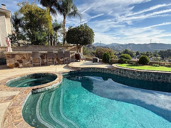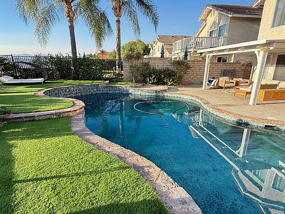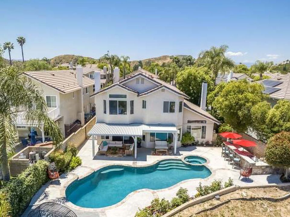 Spacious 5-bedroom, 3-bathroom home with formal living and dining room, open kitchen with custom cabinets, Viking appliances, and center island. Family room overlooks swimming pool with great views. Upstairs: master suite with sitting area, walk-in closet, and luxury bath. Additional bedrooms with large closets.