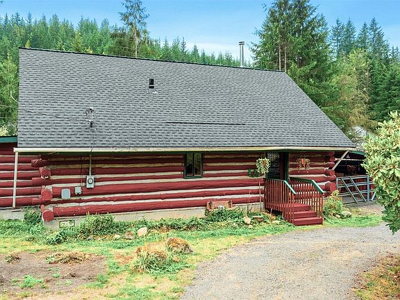 One-of-a-Kind Log Cabin with Bigfoot Flair in Granite Falls. Nestled in the foothills, this two-story tamarack log cabin was once home to the author of Bigfoot: Myth or Reality. Bigfoot greets you at the gates & stands watch at the entrance, setting the tone for a property like no other. Inside, a circular ornate staircase links the main level bedroom, full bath, & living space w/a loft above. Built from Alaska’s toughest tamarack wood, the cabin combines rustic strength with timeless charm, enhanced by a new roof and chimney. On a quarter-acre cul-de-sac lot in River N Forest, you’ll find multiple outbuildings—including a children’s cabin, saloon-style shed, storage, & wood shed—plus room to grow vegetables in a peaceful, private setting.