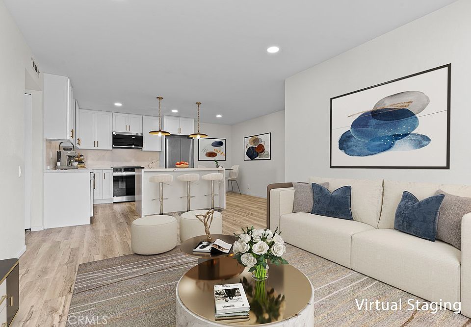 Fully renovated and never lived in post renovations 2-bedroom, 1-bath top-floor unit offering privacy and an open, light-filled layout. Upgrades include Lifeproof Arches Natural luxury vinyl plank flooring, Ducale White marble-look porcelain tile, marble countertops, and copper-colored like fixtures throughout. Modern kitchen with sleek cabinetry and updated finishes, plus a remodeled bathroom. Quiet upper-level location with no units above. Located in a well-maintained Lake Forest community near shopping, dining, parks, and convenient freeway access. True turnkey opportunity.