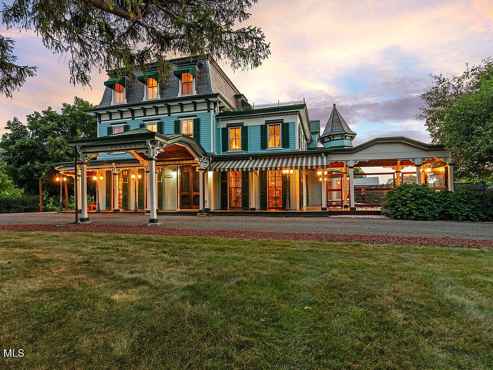 Welcome to this Exquisite Second Empire Victorian Estate on Expansive Grounds beautifully preserved and thoughtfully renovated, nestled on a sprawling manicured property. This grand estate exudes timeless charm and architectural elegance with its ornate detailing, stately columns, and vibrant exterior that captures the spirit of classic 19th-century design.