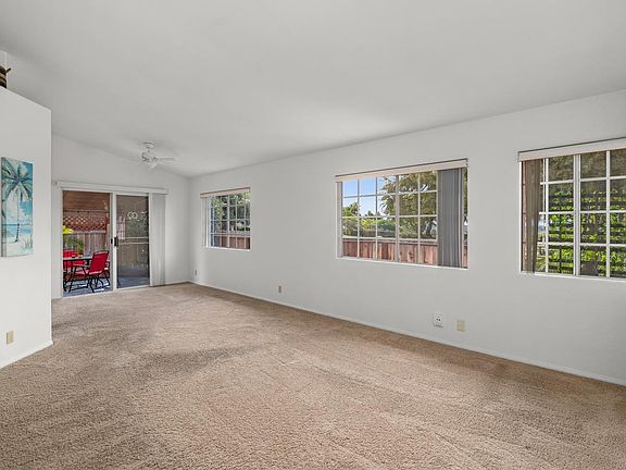 Beautiful single story home on a cul-de-sac in this private subdivision of the Montego tract. 2 pets allowed 2 cats or 2 small dogs. This home has beautiful sunset views and is across the street from a small park/greenbelt area that over looks the golf course. High vaulted ceilings in the large living room connect to the formal dining room and a sliding door out to the backyard. Kitchen has vaulted ceilings, stainless steel appliances, new faucets, a small kitchenette area, a slider to the backyard, and a view of the backyard. Master bedroom has a slider to the backyard, walk in closet, soaking tub, and dual sinks. There are 2 other bedrooms and another bathroom. The backyard has 2 retractable awning that roll out for shade. Great Views out the dining room window. Corner lot faces the park to see the sunsets. There is an inside laundry area. Private and very quiet tract with no public traffic allowed inside the subdivision, only resident vehicles and their guests are allowed. Signs are posted to that effect. The Gardner is included. Close to the freeways 76, 78 and the 5 freeway, restaurants, stores etc. Contact me nine four nine, eight seven four zero four three two. Gardner is paid for by the owner.