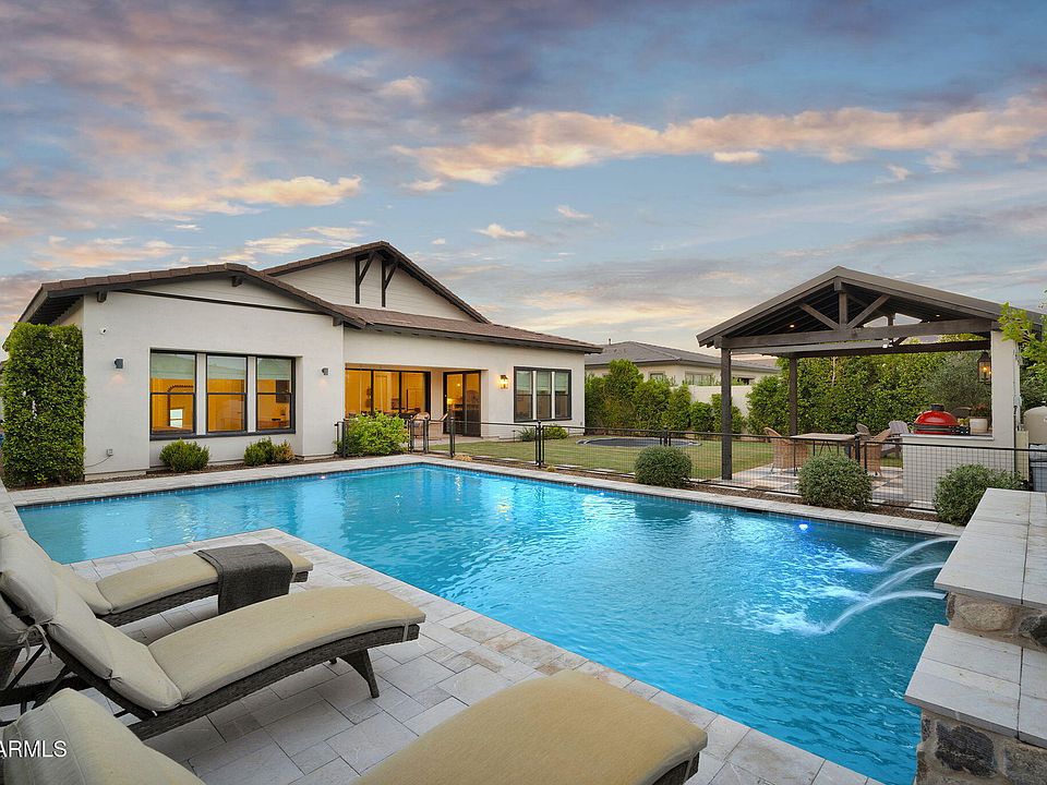$250,000 BACKYARD OASIS!! Welcome to Caleda by Toll Brothers, an intimate GATED community of Luxury Homes anchored by a central community park. Situated in the heart of Queen Creek with direct access to the scenic QC Wash Trail (perfect for walking, biking, etc), this home is perfectly positioned on a 1/4 acre lot with North/South exposure. JUST BUILT in 2022, this popular SOLD-OUT Escena Floorplan features a stunning Modern-Farmhouse elevation, 10' ceilings throughout + a stunning Chef's Kitchen! Step into your private backyard paradise complete with a heated/cooled pool, outdoor kitchen, firepit + in-ground trampoline - all surrounded by lush ficus hedges. Just minutes to Queen Creek's best shopping, dining & entertainment including QC Marketplace & Pecan Lake Entertainment!