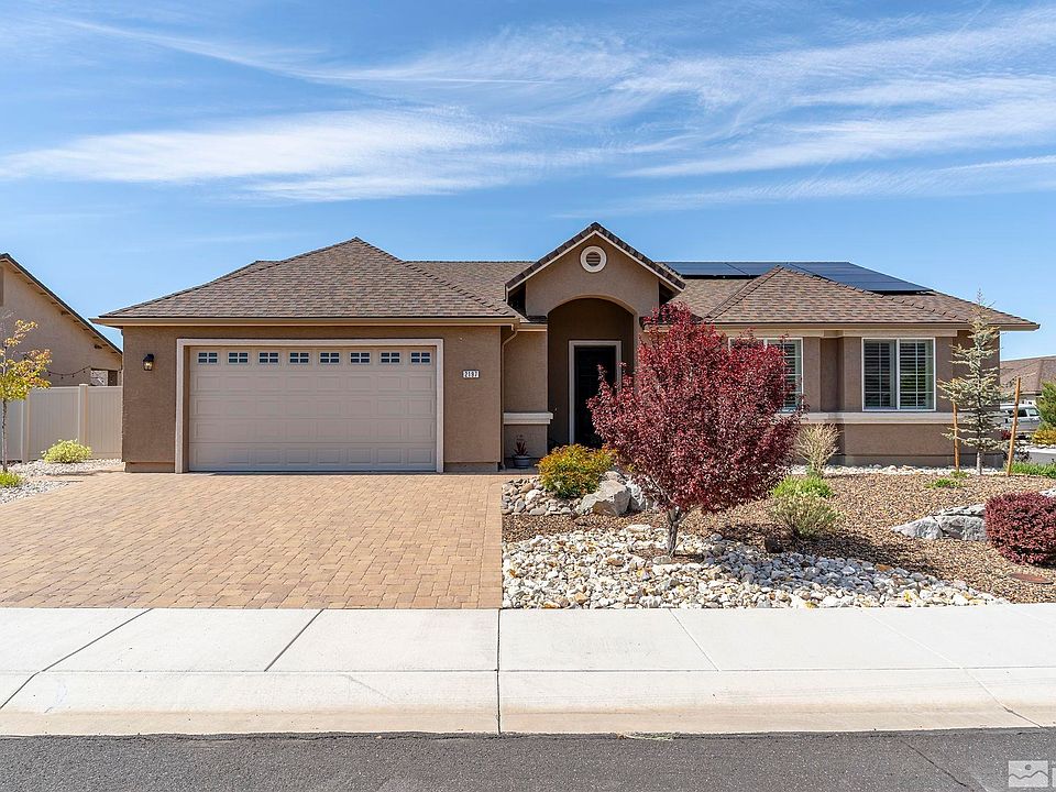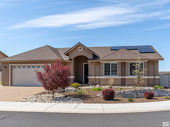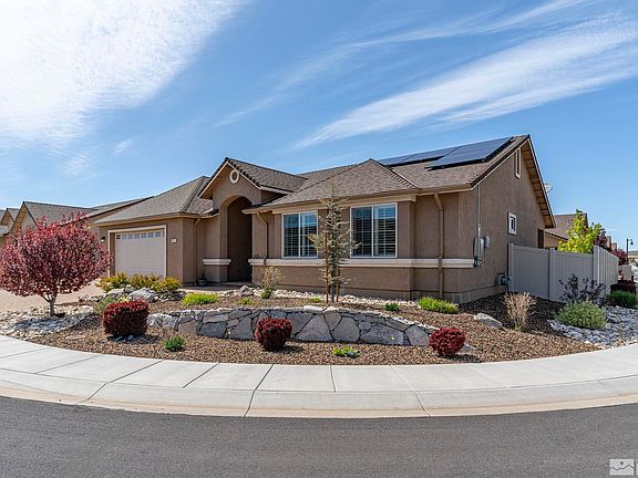 Corner lot, stucco exterior and low maintenance landscaping that does not back the main road located at La Casata in Damonte Ranch. This beautiful home is spacious and offers an open floor plan. Open kitchen with a large wrap around granite breakfast bar, built in microwave, oven and a large pantry. Large laundry room located right off the kitchen with cabinets and sink., Primary bedroom is located on the opposite side of the home from the remaining bedrooms offering separate his and hers closets and multiple vanities. Fourth bedroom just inside the front door does not have a closet. Solar Panels are owned and remain with the property.