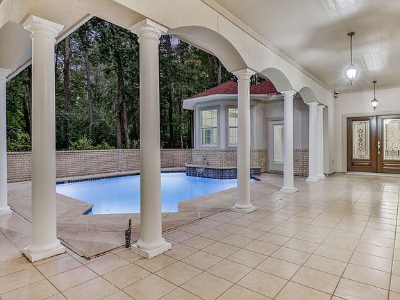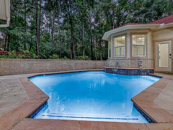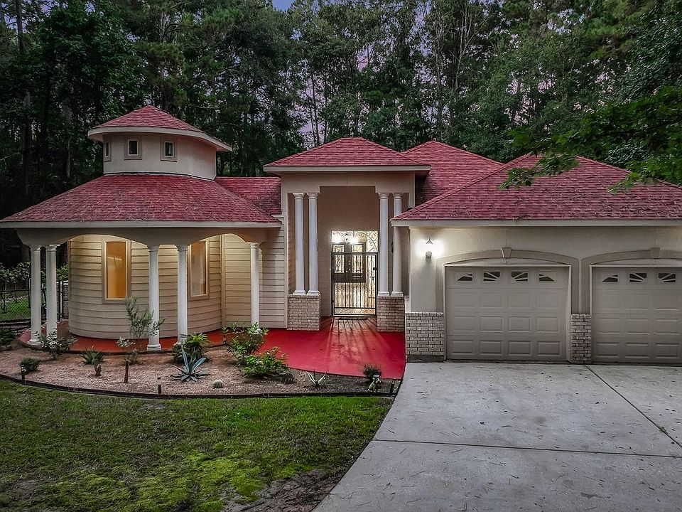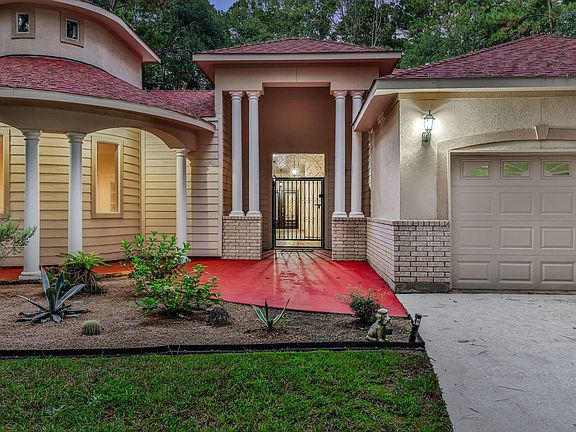 Discover your dream retreat on 2.53 wooded acres, just 7 minutes from Valley Ranch shopping. This custom Mediterranean-inspired stucco and brick home with Greco-Roman columns blends elegance and functionality. Inside, Italian tile and hardwood floors flow throughout 5 bedrooms and 4 baths, including a private cabana suite ideal for guests or multi-generational living. The gourmet kitchen boasts a 13-ft island, custom cabinets, and modern appliances, while living areas feature a library, dining room, and double-sided fireplace. A 3-tier home theater with 7-channel surround sound is perfect for entertaining. Outdoors, enjoy a Greco-Roman style pool with waterfalls, 900 sq. ft. lanai, pergola with bar and grill, vineyard, and raised garden. Three fenced areas provide room for pets and play. With recent updates including fresh paint, remodeled primary bath, and three AC units, this property offers luxury, privacy, and convenience in a serene forest setting. Schedule your tour today!