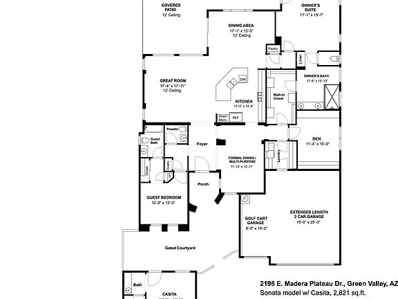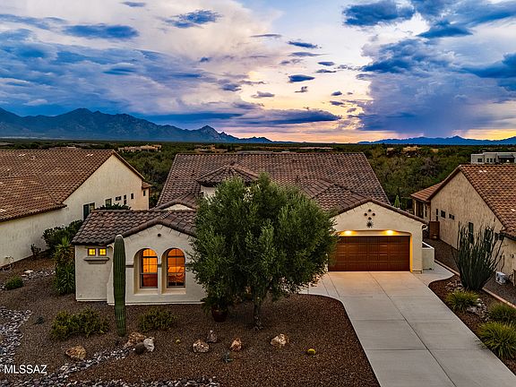 Breathtaking views! Located on a sought-after street in Quail Creek, this Spanish Colonial Sonata model w/ private entry Casita offers 2,821 total sq.ft., incl. 3 BR, 3.5 BA, Den and multi-purpose room, and backs to pristine natural desert with spectacular views of Mounts Wrightson, Hopkins and Elephant Head. Wonderful curb appeal w/ gated front courtyard, stunning wood entry door. Inside are soaring 12' ceilings in the kitchen, great room and dining area, crown moulding, hand scraped hardwood flooring, and plenty of windows to take in the stunning views. Kitchen has a grand island w/ granite counters, upgraded cabinets, SS appliances, 36'' gas cooktop, new Bosch dishwasher. Wake up to sunrise over the Santa Rita's, the expanded Owner's Suite has box bay window and exit to rear patio. The main bath has dual vanity, curbless, all-tile walk-in shower, and huge walk-in closet w/ custom built-ins and doors at both ends, offering easy access to the laundry. Guest bedroom and private Casita both offer en suite baths. New upgraded Shaw carpeting in owner's suite and guest room. Den offers an ideal space for work or hobbies, w/ built-in desks and storage. Front multi-purpose room can be used for formal dining, game room, a quiet reading nook or 2nd office. Separate powder room for guests. New, upgraded lighting throughout, including all-LED recessed lighting, entry chandelier, new interior receptacles w/USB charging capabilities, interior dimmers. Laundry has new Electrolux washer and dryer, and additional cabinets for added storage. Spotless, extended length garage w/ golf cart bay, new epoxy floors, new custom garage cabinets and new overhead lighting. Plus: fully insulated garage doors, walls and attic space above garage. New exterior and interior paint throughout; 5" baseboards; 8' doors throughout; rain gutters; upgraded roof with 2 layers of 40 lb. underlayment. Dine alfresco under the extended covered paver patio, or gather around the fire pit and enjoy the peaceful and serene rear yard, jaw dropping views, and the occasional visits from neighboring wildlife. This home has it all!