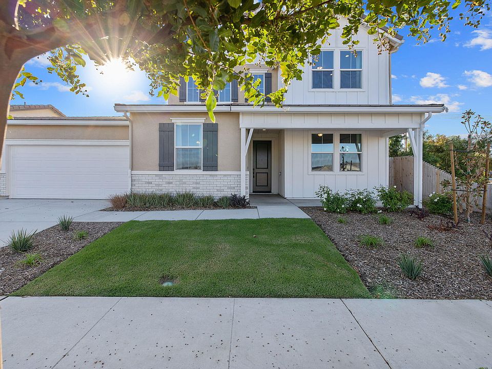 Step into this stunning 3,518 sq ft model home, featuring 5 bedrooms, 4 bathrooms, and owned solar, designed for upscale, eco-conscious living on a prime corner lot. Exquisite designer finishes, custom wall accents, and premium upgrades captivate from the moment you enter. The bright, airy open-concept main living area flows through large sliding glass doors to a California room perfect for entertaining or relaxing outdoors. The gourmet kitchen blends seamlessly with the dining nook, creating a warm, inviting space for gatherings. The first-floor primary suite offers a serene retreat, boasting a spa-inspired bathroom with a freestanding soaking tub, spacious tiled shower, and wraparound walk-in closet. Also downstairs, a versatile den, drop zone off the garage, built-in pet area, and secondary bedroom with bathroom suit guests or multigenerational living. Upstairs offers a loft, full laundry room with sink and cabinetry, three additional bedrooms, and two bathrooms for ample family, work, or leisure space. This home blends comfort, elegance, and sustainability in every detail. Don't miss your chance to own this meticulously crafted residence.