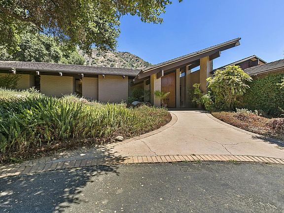 Resting on nearly 2 acres of level gated grounds is this Custom Built Architectural Modern offering the finest in materials and craftsmanship, privacy, and an exceptional design. Ceilings span up to 18 ft in height, thick slumpstone walls, newer in-laid travertine flooring, updated baths. The home went through a remodel by Architect James Coane in 2007-08. Oversized dramatic formal rooms with large fireplace, wood beamed ceilings throughout, skylights. A large foyer welcomes you to the homeand opens onto
