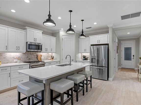 Welcome to heart of downtown Naples! This “smart home” is built by Neal Homes, it's is the epitome of quality and comfort in beautiful Marquesa Isles- a natural gas community. As you step through the front door, you'll be greeted by a light-filled open floor plan with high ceilings with crown molding and large low-E impact windows & stacking sliders that showcase the beautiful views of the private preserve area. The gourmet kitchen is a chef's dream, complete with stainless steel appliances, 36” upper cabinets, and an island that makes entertaining & baking a breeze! The main suite has been upgraded with tile flooring, a closet organizer, and doors going into the ensuite. The guest bedroom is equally spacious and the den is the ideal for your home office, media room, or another bedroom. Outside, the screened in patio/lanai is perfect for the FL indoor-outdoor living style where you can grill and chill. The villa also has a 2-car garage, providing plenty of space for your cars or storage needs. With its' prime location near world-class dining, shopping, and entertainment of Downtown Naples, this villa is the perfect place to call home. Don't miss out on this incredible opportunity!