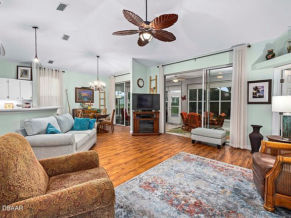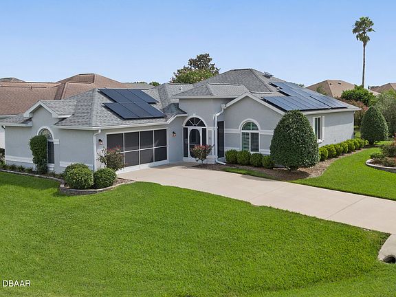 Welcome to this beautifully updated 3 bedroom, 2 bathroom home offering 1,822 square feet of under air living space on a spacious corner lot in the desirable Ocala Palms community. With nearly $80,000 in upgrades, including fully paid solar panels, this high efficiency home is designed for comfort and savings with exceptionally low electric bills. The screened front patio opens to soaring ceilings, elegant flooring, and an open floor plan. The kitchen is a showpiece with an oversized island, quartz countertops, stylish backsplash, and generous seating space, all flowing seamlessly into the great room, perfect for entertaining. The primary suite provides a private retreat with dual vanities, a soaking tub, and separate shower, plus the added benefit of a dedicated mini split system for personalized comfort. The second bedroom is generous in size with a deep closet and natural light, while the third bedroom, located at the front of the home with glass front doors, is ideal as an office or guest room. The enclosed lanai provides additional living space with a birdcage view of the backyard. Recent upgrades and features include a 2018 4 ton 17 SEER AC, 2015 roof, 2021 40 gallon water heater, Low E windows, plantation shutters, extra attic insulation, a transfer switch for a generator, and paid off 9.5KW solar panels. Ocala Palms is a gated golf community offering access to a clubhouse, restaurant, indoor and outdoor pools, golf, and a wide range of clubs and activities. This is a move in ready home with smart upgrades, modern comforts, and excellent energy efficiency.