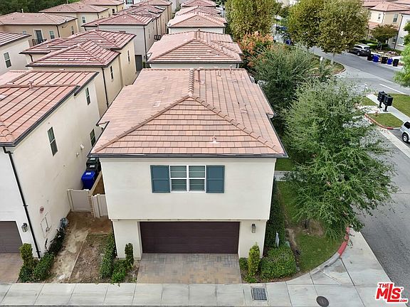 YOUR NEW HOME AWAITS IN BEAUTIFUL VILLA METRO! Welcome to resort-style living in the highly sought-after gated community of Villa Metro where modern design meets California charm. This stylish two-story detached home offers 2 bedrooms and 2 baths, featuring elegant wood-laminate flooring, plush carpeting, and designer accent walls throughout. The first-floor primary suite offers the perfect retreat with a private bath and sliding glass doors that open to your own tranquil patio. Ideal for morning coffee or quiet evenings. The open-concept upper level is bright and airy, boasting a chef-inspired kitchen with crisp white cabinetry, stainless-steel refrigerator, and appliances. A center island with bar seating that flows seamlessly into the dining area and cozy living room. Step through the sliding door to your covered balcony, a perfect spot to unwind and enjoy the breeze. Down the hall, discover the charming custom sky-blue barn doors leading to your second bedroom with its own a full bath, stackable washer/dryer, and convenient hallway storage. Enjoy direct access to your two-car attached garage, plus all the perks of Villa Metro's resort-inspired amenities a sparkling pool and spa, kiddie pool, clubhouse, BBQs, fire pit, community garden, bike path access, playground, and scenic courtyards perfect for evening strolls. Ideally located just minutes from the Metrolink station, shopping, dining, Six Flags Magic Mountain, and top-rated schools. This corner home is filled with natural light and designed for comfort, convenience, and effortless living! Low Mello Roos $1,484.00
