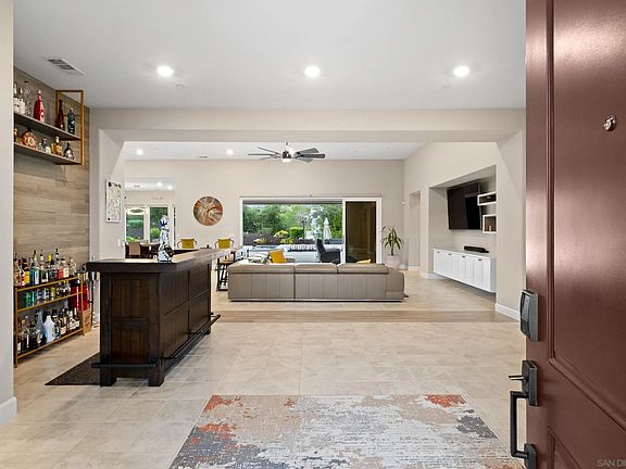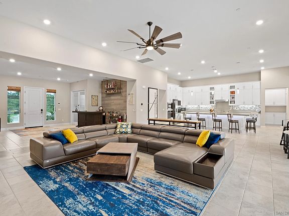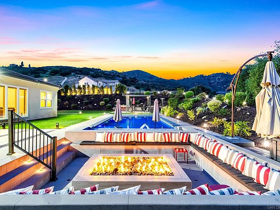 Discover refined modern living in this newer single-story smart home, beautifully positioned on large 1.5 acres of tranquil, view-filled landscape. Nestled on a serene, elevated cul-de-sac, this 2020 Lennar masterpiece features nearly $300,000 in custom landscaping, creating a true resort retreat. A stunning saltwater pool and spa anchor the outdoor oasis, while a dramatic fire pit with seating for 30 sets the stage for unforgettable entertaining. With paid solar and Tesla batteries, the home produces enough energy to run the entire property and heat the pool year-round. Elevated perfectly to capture sweeping vistas, this home delivers luxury, efficiency, and serenity in one extraordinary package. See supplement for more. Crafted for those who value privacy, luxury, and effortless indoor–outdoor living, this stunning single-story residence sits on beautifully landscaped grounds designed for true resort-style enjoyment. A custom saltwater pool and spa anchor the backyard, complemented by a dramatic fire pit with built-in seating for 30, a shaded pergola lounge, and a designer mobile outdoor kitchen for seamless al fresco dining. A gated side access with steps adds convenience and flow. Inside, soaring ceilings and natural light create an inviting, modern atmosphere. The great room features disappearing glass walls that blend into a stylish California room with fireplace, outdoor TV, and motorized shades—mirrored by automated window treatments in the living area. The chef’s kitchen impresses with high-end stainless appliances, a large quartz island, custom cabinetry, and both butler’s and walk-in pantries. The dining area frames picturesque views through floor-to-ceiling windows. Four ensuite bedrooms plus a flexible bonus room offer space for an office, studio, gym, or media room. The primary suite includes elegant molding, a spa-like bath with freestanding tub, dual vanities, a frameless shower, and a generous walk-in closet. California Closet built-ins enhance the primary suite, living room, and garage. Smart-home upgrades include voice-controlled thermostat, tankless water heater, Ring doorbell, paid solar (also heating the pool), Tesla batteries, EV pre-wire, generator, self-cleaning pool robots, LED lighting, dual A/C zones, alarm system, fire sprinklers, low-energy windows, and ceiling fans in all rooms. Yard is pre-wired for additional gas/electric and includes a turf pet area. The solar/battery system produces enough energy to power the home, heat the pool, and generate credits year-round. Harmony Grove Village amenities include a resort pool, spa, clubhouse, grilling areas, multiple parks, dog park, and over two miles of scenic trails for hiking, biking, and horseback riding.
