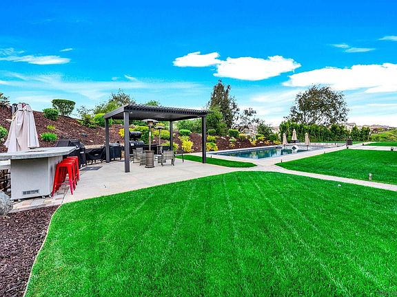 Discover refined modern living in this newer single-story smart home, beautifully positioned on 1.5 acres of tranquil, view-filled landscape. Nestled on a serene, elevated cul-de-sac, this 2020 Lennar masterpiece features nearly $300,000 in custom landscaping, creating a true resort retreat. A stunning saltwater pool and spa anchor the outdoor oasis, while a dramatic fire pit with seating for 30 sets the stage for unforgettable entertaining. With paid solar and Tesla batteries, the home produces enough energy to run the entire property and heat the pool year-round. Elevated perfectly to capture sweeping vistas, this home delivers luxury, efficiency, and serenity in one extraordinary package. See supplement for more. Crafted for those who value privacy, luxury, and effortless indoor–outdoor living, this stunning single-story residence sits on beautifully landscaped grounds designed for true resort-style enjoyment. A custom saltwater pool and spa anchor the backyard, complemented by a dramatic fire pit with built-in seating for 30, a shaded pergola lounge, and a designer mobile outdoor kitchen for seamless al fresco dining. A gated side access with steps adds convenience and flow. Inside, soaring ceilings and natural light create an inviting, modern atmosphere. The great room features disappearing glass walls that blend into a stylish California room with fireplace, outdoor TV, and motorized shades—mirrored by automated window treatments in the living area. The chef’s kitchen impresses with high-end stainless appliances, a large quartz island, custom cabinetry, and both butler’s and walk-in pantries. The dining area frames picturesque views through floor-to-ceiling windows. Four ensuite bedrooms plus a flexible bonus room offer space for an office, studio, gym, or media room. The primary suite includes elegant molding, a spa-like bath with freestanding tub, dual vanities, a frameless shower, and a generous walk-in closet. California Closet built-ins enhance the primary suite, living room, and garage. Smart-home upgrades include voice-controlled thermostat, tankless water heater, Ring doorbell, paid solar (also heating the pool), Tesla batteries, EV pre-wire, generator, self-cleaning pool robots, LED lighting, dual A/C zones, alarm system, fire sprinklers, low-energy windows, and ceiling fans in all rooms. Yard is pre-wired for additional gas/electric and includes a turf pet area. The solar/battery system produces enough energy to power the home, heat the pool, and generate credits year-round. Harmony Grove Village amenities include a resort pool, spa, clubhouse, grilling areas, multiple parks, dog park, and over two miles of scenic trails for hiking, biking, and horseback riding.