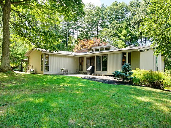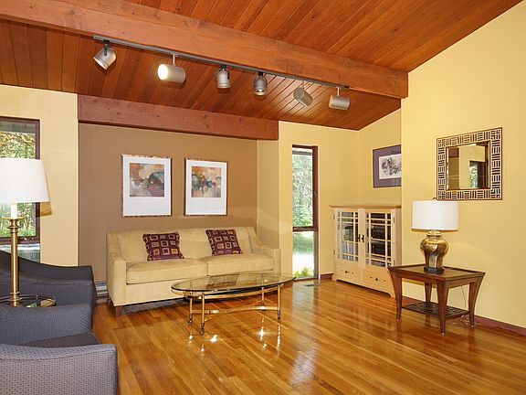 Stunning architectural detail can be found in this custom contemporary set on a gorgeous private1.65 acre lot. The tongue and groove wood beamed cathedral ceilings and the floor to ceiling windows provide so much character and natural light. The shared see through fireplace is the focal point of both the living room and dining room which also feature beautiful hardwood flooring. In the eat in kitchen you will find many upgrades including a cathedral wood beamed ceiling, granite countertops, stainless appliances, under cabinet lighting and tile backsplash. The family room offers a cathedral ceiling, skylights, newer carpet and a slider to a side patio. There are 3 generous sized bedrooms including a beautiful master bedroom suite with access to another patio overlooking the private back yard. Other features include a 2 car garage, central air and a finished basement. Great home for entertaining inside and out!! Please see the attached list of highlights - too many to list here!