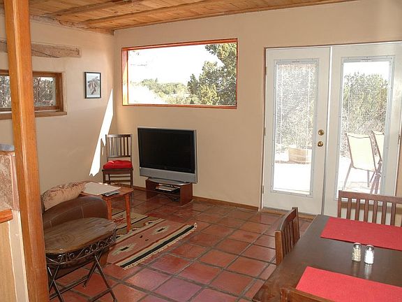This unit is perfect for one individual. There is great mountain views from the deck. Please do not view this property without an appointment. We are not accepting smokers or pets. This is a guest house on 5 acres of land approximately 10 miles south of Santa Fe. Occupant pays for electricity although it is based on a sub meter with no tax or service charge. Water is from a wonderful tasting well and is free. The guest house is partially furnished as shown. Heat is from a wood burning stove requiring the purchase of fire wood and also radiant heaters. There is a small second bedroom, perfect for an office. The kitchen has a dishwasher, stove, microwave, coffee maker and refrigerator. DSL internet is available through CenturyLink. The property is now available to be shown and rented. E-mail for a showing. NOTE: Please be vaccinated with a shot card ! Rent is $1200 with a security deposit of $1000. There is a $35.00 charge for a credit and criminal background check unless forwarded from Zillow.