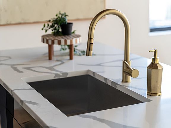 Light oak hardwood floors flow effortlessly through the home with a stunning glass stairwell complementing beautifully curated light fixtures for contemporary edge. Impressive kitchen design sets new standards with style and sophistication in every design selection and finish. Dark-stained wood ceilings, white quartz countertops with a waterfall island, sleek black or gray custom cabinetry, and gold fixtures create contrast in a polished bold look, while high-end stainless-steel appliances add a finishing touch.