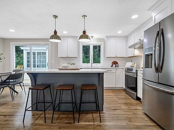 This home is an entertainer's dream! Relax on your new deck, watch swimmers from your enclosed cabana, or stroll through the expansive, beautifully landscaped yard. Thoughtfully remodeled, this home boasts 3 large bedrooms, a primary en-suite and walk-in closet, hardwood floors, a new kitchen with quartz countertops, all new appliances, and a beverage station! Watch the sunset from the sun room with a vaulted wood ceiling and double sliding doors that open to the patio and built-in pool. A finished basement has an additional family room, mud room, exercise room, plenty of storage, and access to a two-car garage. Other upgrades include new windows, a new boiler and hot water system, and new roofs on the house and two outbuildings. This home has privacy and is located at the end of a two-house road with 4.6 acres surrounded by conservation land. A convenient commuter location in apple country and close to the hip restaurant scene in Hudson, this is your opportunity to own in Stow!