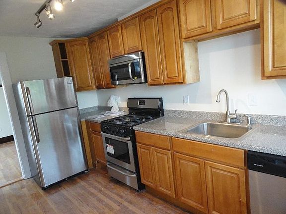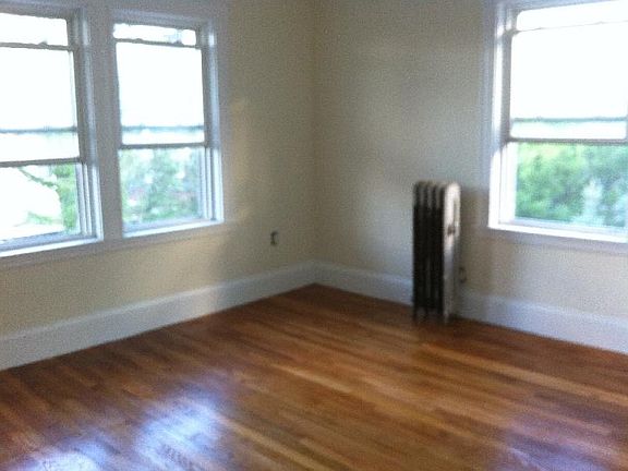 Apartment completely renovated and has both front and back porches and a small yard, has 4 large equal sized bedrooms, large living room, 2 modern bathrooms, modern kitchen with all stainless steel appliances (dishwasher, disposal, built-in microwave, fridge, gas stove), track lighting, refinished hardwood floors throughout.Free stackable high efficiency laundry in the apartment. Building was just completely insulated. Pet negotiable.