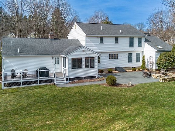 Country living with easy access to everything! This sun-filled colonial is set back on a level 1.6-acre lot in Westford Center. A versatile floor plan offers plenty of room for entertaining and every-day living with cathedral ceilings throughout. Main level features large living room leading to a home office, and a bedroom suite with newly-renovated bath. Opposite the two-story foyer is a dining room, expansive kitchen with beautiful granite counterspace, and a large family room with cozy Jotul fireplace insert. Enjoy the functionality of a mud room, laundry, and 3/4 bath when you enter from the two-car garage. Find serenity in the 4-season sunroom that overlooks the backyard and conservation land. There are three bedrooms and a renovated bath on the second floor. Outdoor amenities include a maintenance-free deck, patio with field stone firepit, and shed. Sidewalks lead to the town center library, muffin shop and more! Short drive to area retail, dining, and Rte 495 for easy commuting.