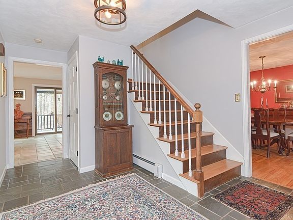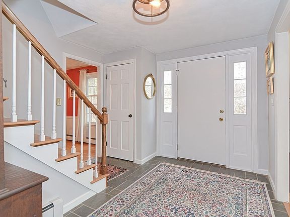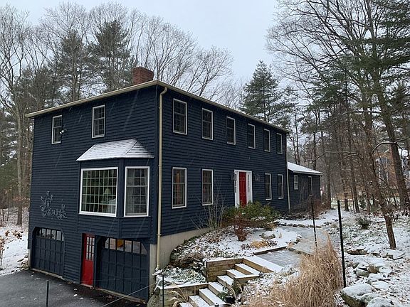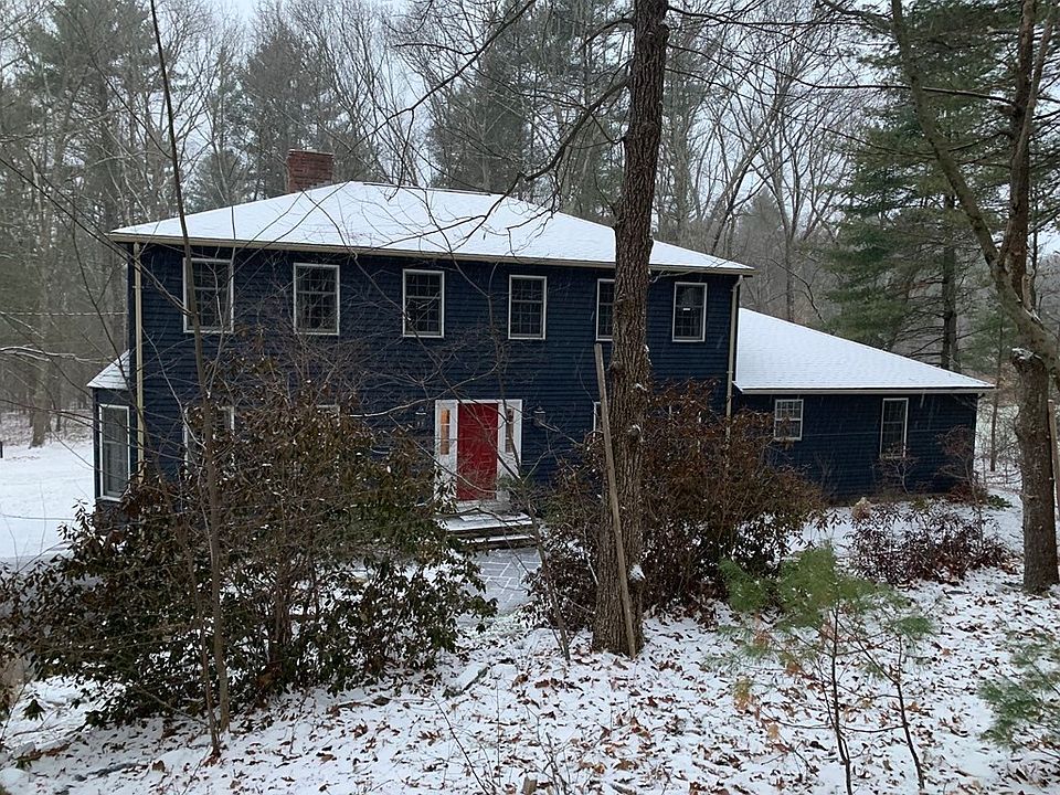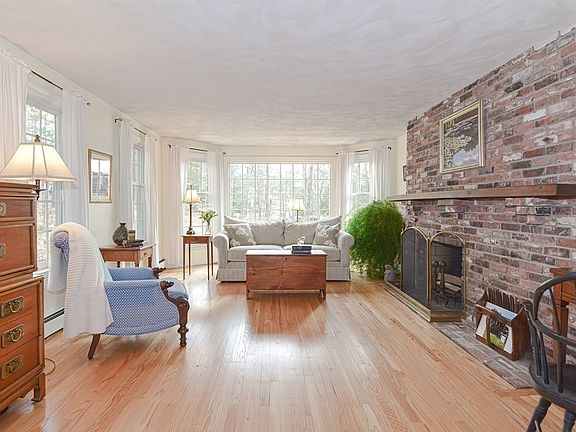 Traditional Center Entrance Colonial situated on 2.6 private acres offers 12 Rooms, 5 Bedrooms with separate entrance au-pair or home office potential. The Formal DR features wainscoting and HW floors. The Formal LR and Family Room feature enormous brick hearth fireplaces and bay windows overlooking spectacular views of mature plantings and landscape. The Kitchen features SS appliances, Corian Counters and Peninsula Bar with seating. Step out onto the Screened Porch and enjoy the beautiful wooded views or relax in the hot tub after a long day. The au pair/in-law offers a kitchen, office, family rm & bedroom w/HW flooring, walk-in closet & full bath. Four bedrooms on the second floor all feature hardwood flooring. The Front to Back Primary Bedroom has a Full Bath with tiled shower, tile flooring and new vanity. Partially finished LL playroom is a great space for work out room. Tons of storage in the unfinished area. ~25 miles to Boston & Providence. ~4 Miles to Commuter Rail!