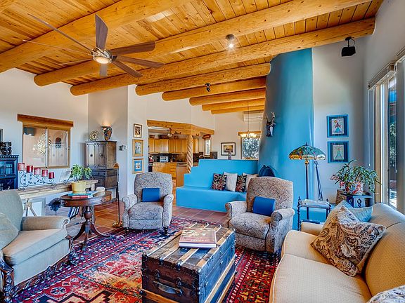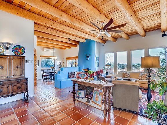 PRE-INSPECTED! This Eldorado masterpiece is conveniently located within a 5 minute drive to 285, the Agora shopping center, the library, Community School, & Senior Center. From the open concept living area with its high ceiling, vigas and planks, Kiva fireplace, & Saltillo tiles, to the recently remodeled kitchen w/granite countertops & nearly new appliances, you will want to call this house your home. Glass doors lead from the dining area to a 2-level flagstone patio with spectacular views of the Jemez, Sandia, & Ortiz mountains, & the Cerrillos Hills. Enjoy breathtaking sunsets from the portillo, ramada or other vantage points in the spacious fully walled backyard -- or take in the view from four expansive windows in the living room. The large master bedroom features high-ceilings, vigas and planks & a Kiva fireplace. The newly remodeled ensuite bathroom features a beautifully tiled shower, a soaking tub & double sinks w/granite countertops. The master walk-in closet offers plenty of space. The second bedroom or den has two closets and sliding glass doors leading to the ramada. The third bedroom features a walk-in closet & a newly remodeled ensuite bathroom. Other highlights include an outdoor Kiva fireplace w/bancos, a fountain, mature vines, shrubbery, & trees, walled front patio with seating area & a view of the Sangre de Cristo mountains, as well as, a huge dog run/RV parking area that is fenced, gated, and meets HOA RV fencing requirements.