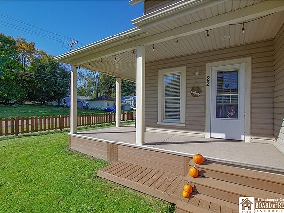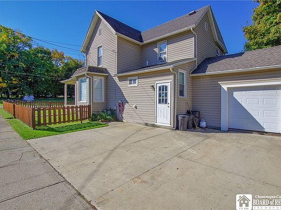 This aesthetically pleasing home is just a short jaunt to Chautauqua Lake, Lucille Ball Park, Harbor Hotel, public boat launch and marinas. The quaint village of celoron offer affordable lake life. Located near the commercial hub of Fairmount ave, within Southwestern School district and in close proximity to downtown Jamestown make for convenient living. The home has been well cared for, updated and is ready for it's new owners. The original architecture blends well with the modern touches. High ceilings, wood trim, trendy finishes all blend well to create a welcoming environment. The kitchen has room for a dining area and comes equipped with appliances. The sprawling living/dining combo affords the homeowner many options to configure furnishings. The wood trim and custom trayed ceilings add to the ambiance. Each bedroom has it's own character. The primary bedroom has an open suite vibe with soaking tub, balcony and walk in closet. Convenient first floor bath, laundry and drop area. Enjoy the outdoors on the wrap around covered porch. Fenced lot, vinyl siding, attached garage, vinyl windows, architectural shingled roof, and concrete driveway with ample parking space.
