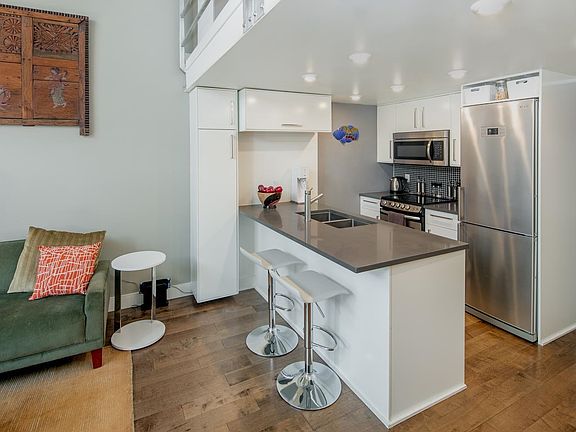 Oversized windowsAbundant natural lightModern kitchenStainless steel appliancesQuartz countertopsSleek cabinetryHardwood floors