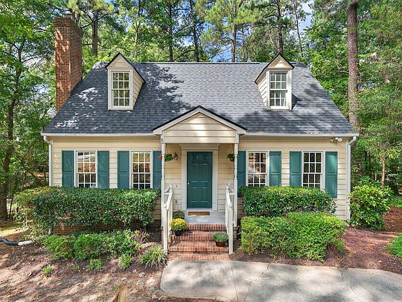 Cape Cod classic in the acclaimed Woodcroft neighborhood in south Durham. Tucked away at the end of a quiet Cul-de-Sac, this 3-bedroom, 2-bath has the convenience of both first floor and second floor owner's suites. Nestled on a wooded and private large lot, the cozy breakfast nook, featuring 2 skylights, and elevated backyard deck take full advantage of the wooded views and the lure of direct access to the Woodcroft Trail system that also connects to the American Tobacco Trial. Beautiful oak hardwoods on main floor, new kitchen & bathroom LVP floors, NEW ROOF in 2024, large masonry fireplace, crown and chair rail moldings, and fresh paint throughout make this house fresh and attractive. HVAC replaced in 2017, but the coil was replaced in 2024 making the unit like new. The large crawl space is ideal for storage and makes easy access to all the systems. Woodcroft pool/clubhouse and tennis membership is optional and not included in the Woodcroft HOA dues. HOA documents available at: https://www.casnc.com/communities/woodcroft-community/ Walk/bike/drive to the extremely close Streets at Southpoint Mall, multiple grocery Stores and restaurants. Don't forget to notice the name Tim Cook on the mailbox post when you visit. He lived in the house in the 1980s and went on to become the CEO of Apple Inc.