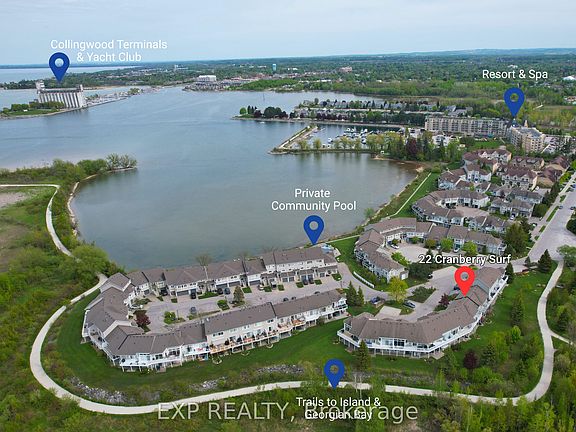 With views of Georgian Bay, a neighborhood saltwater pool, and direct access to nature, 22 Cranberry Surf offers the perfect blend of modern comfort and outdoor adventure. This low-maintenance, two-storey condo features an open-concept main floor with a cozy gas fireplace, breakfast bar, and walkout to a backyard patio backing onto the scenic waterfront trail. Upstairs, the primary bedroom boasts a balcony with bay views and an ensuite, while two additional bedrooms, a full bath, and laundry provide ample space. Enjoy the convenience of driveway parking, visitor spots, and plenty of indoor and outdoor storage. Ideally located near Blue Mountain, Collingwood's historic downtown, and steps from the spa, this is a serene retreat with easy access to shopping, dining, and year-round recreation. Don't miss your chance to experience the best of Collingwood living!