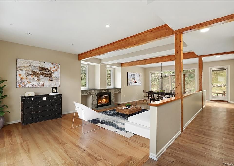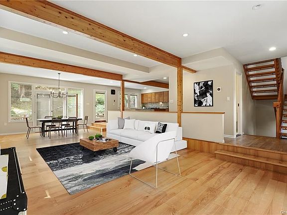 Best location in Deer Ridge, a townhome community that's a hidden gem with loft-like modern Scandinavian design. This end unit with light streaming in from 3 exposures has lawn area, beautiful outdoor views and 1 car garage with space for more driveway parking. The Great Room boasts a fireplace and wood beams on the high ceilings. It opens to large, spacious Kitchen with stainless steel appliances. Also on the main level is a powder room & laundry room/pantry. Upstairs, there is a Primary suite w/ its own bath and private balcony. A hall bath and 2 more generous bedrooms complete that level. The lower level has a huge L shaped rec room w/ full bath for au pair or guest space. The Deer Ridge community offers a great lifestyle & great privacy. The powder room & appliances have been updated. Close to shopping and dining in Mt Kisco, the Saw Mill Pkwy & Mt Kisco train. Photos with furniture are virtually staged. Beautifully maintained and ready for occupancy. Also for sale MLS 6209141