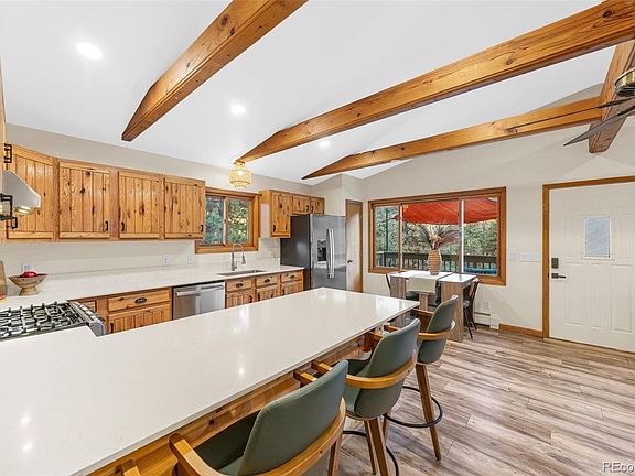 This beautifully updated 4-bedroom, 2-bath South facing home with walk-out basement delivers authentic mountain living, vaulted ceilings with dramatic wood beams, a cozy wood-burning fireplace, and a brand-new quartz-top kitchen that brings a fresh, elegant vibe without losing rustic charm. Kitchen appliances, flooring, and both bathrooms all remodeled in 2023 as well as an almost brand new boiler for ease of life upon moving in. Starlink has been installed so working from home is never an issue.