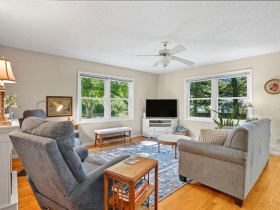 Welcome home to this 4-bedroom ranch filled with natural light and timeless character! Beautiful oak floors flow through the main level, leading to a fabulous kitchen featuring a breakfast bar, pantry, subway tile backsplash, built-in microwave, Bosch dishwasher, and cabinet pullouts for easy storage. Just off the kitchen, the added sunroom/dining room floods the home with light and creates the perfect gathering space. The main level also boasts three spacious bedrooms and multiple ceiling fans throughout. The finished lower level adds great living space with a cozy wood-burning stove. Storage room with built in shelving. Exterior highlights include vinyl windows, newer central A/C, and an attached 2-car garage. Step outside and relax in the beautifully landscaped yard, featuring lush plantings, shade trees, and detailed landscaping that creates a private retreat, a deck, stone patio, fenced yard, shed, and even a playhouse! Leaf filters on the gutters offer peace of mind and easy maintenance. All tucked away on a quaint cul-de-sac, this home blends comfort, functionality, and charm—inside and out.