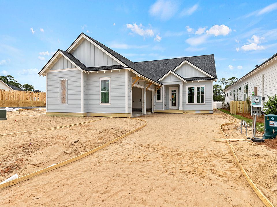 Experience the perfect blend of modern luxury and serene natural surroundings in this new construction home in Powell Landing West in the Watersound Origins community. Targeted for completion in Dec. '25, the Cyra floor plan on home site PLW 36 by Arkon Group, offers 3 bedrooms, 3.5 bathrooms, a study, and 2,213 square feet of thoughtfully designed living space. Designed for both comfort and style, this home boasts premium engineered wood floors throughout, upgraded tile accents, and an extended kitchen island perfect for entertaining. The chef's kitchen features high-end stainless steel appliances, stacked cabinets to the ceiling with elegant lighting, tile backsplash, and a spacious open layout that seamlessly connects to the living and dining areas. The expansive screened rear porch creates an inviting outdoor retreat experience and a perfect spot to get cozy next to the fireplace in the fall and winter months. The primary suite includes a spa-like bathroom and a walk-in closet, while two additional guest bedrooms each have en-suite bathrooms for privacy. A gas lantern on the front porch adds timeless charm, welcoming you home in true Southern style. With 435 sq ft of covered porches, a 2-car garage, and high-end finishes throughout, this home is designed to maximize luxury and livability.